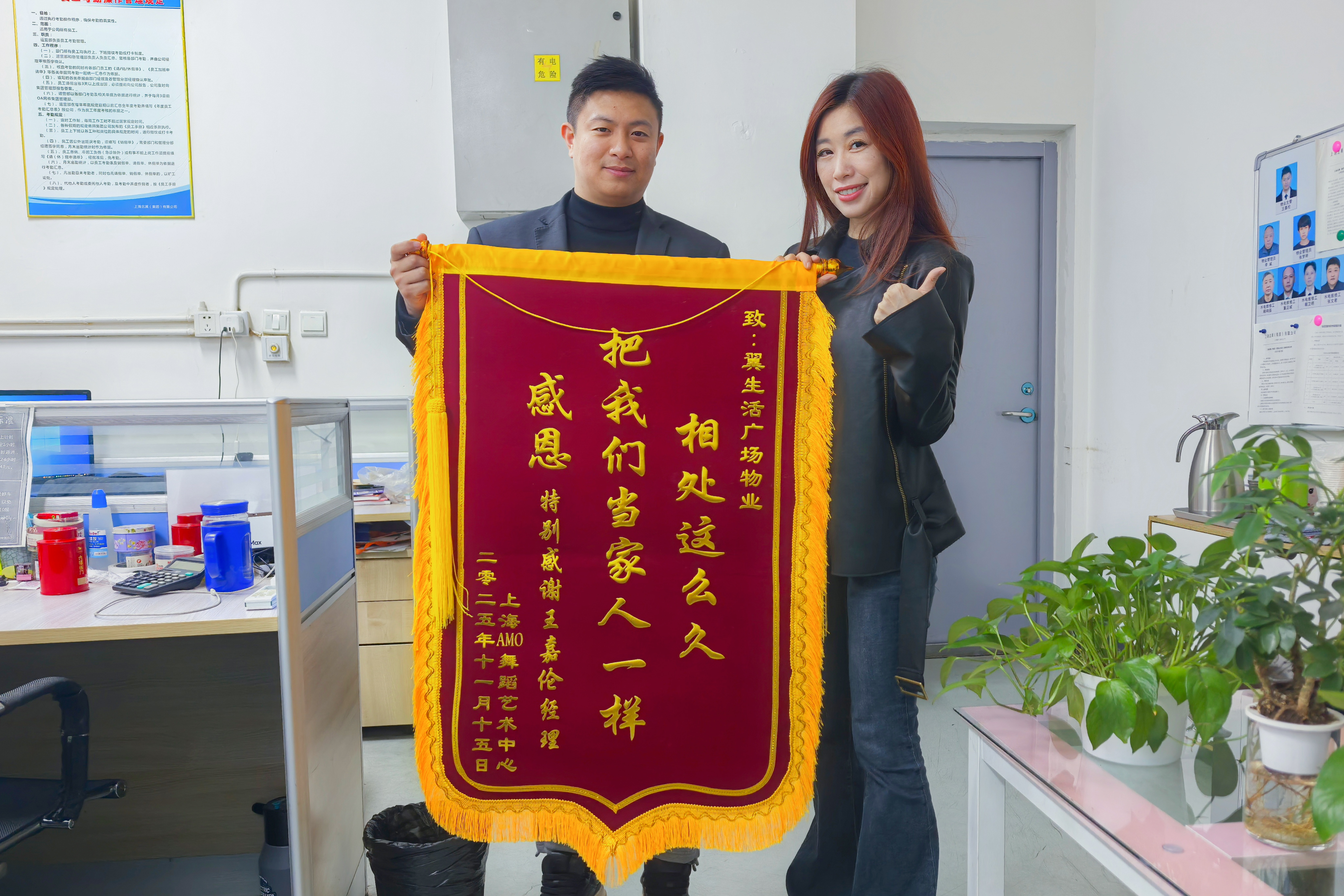 12月24日下午,北翼集团下属翼生活广场收到了一份满载温情的礼物——来自广场内三楼AMO舞蹈艺术中心赠送的致谢锦旗。